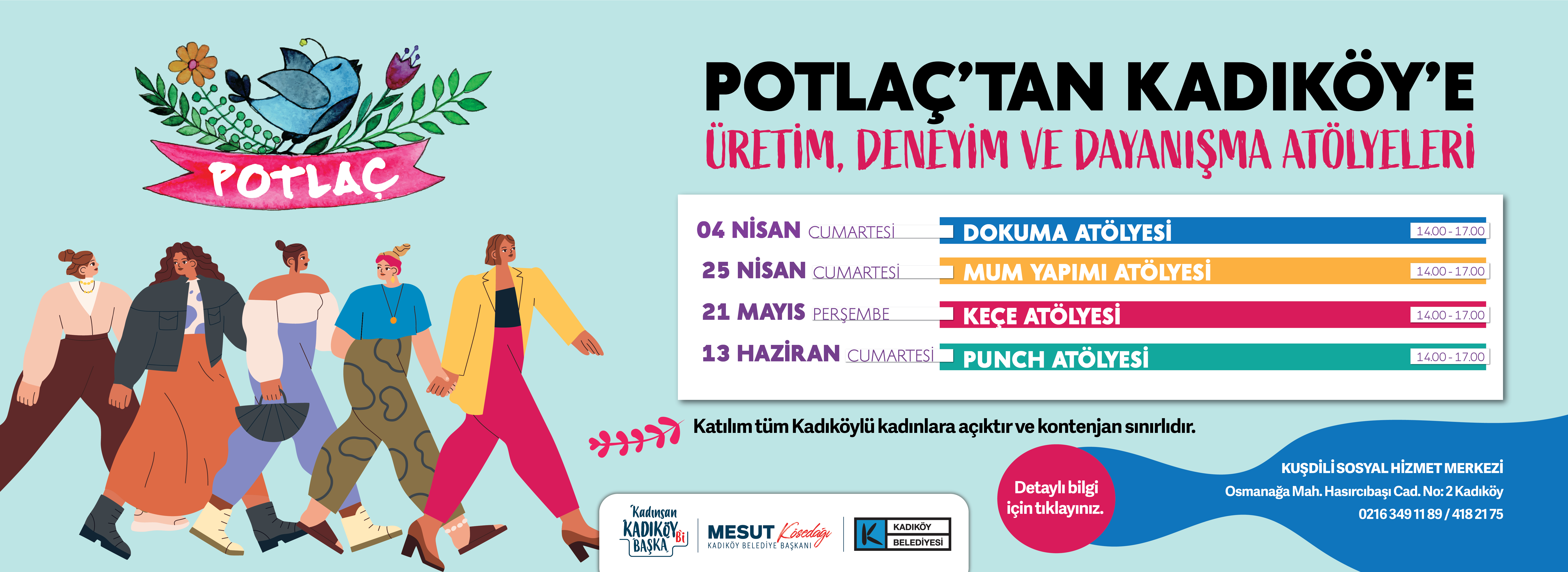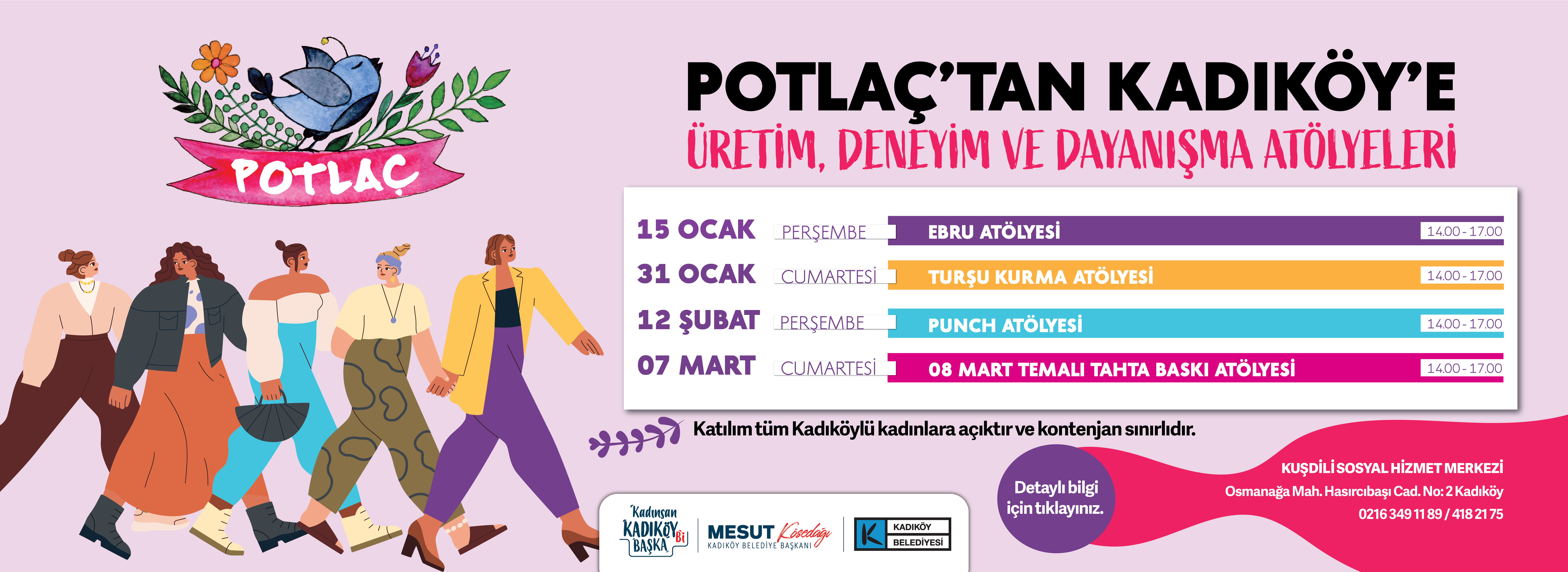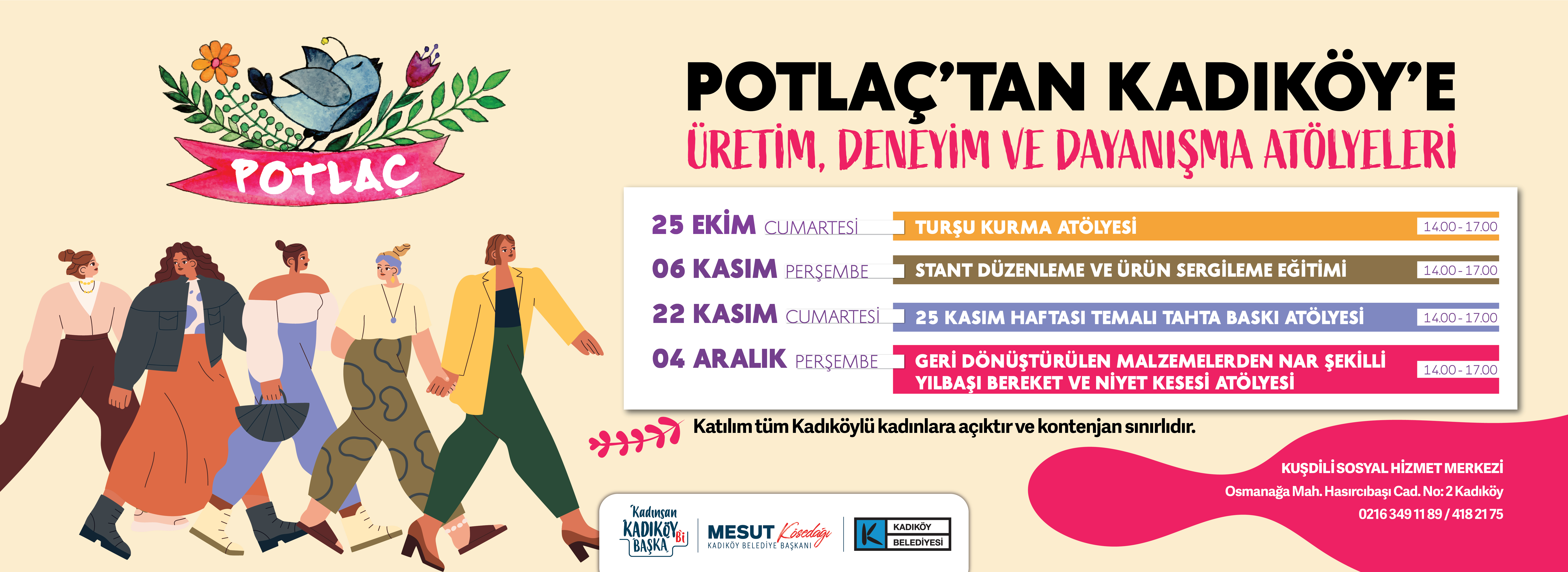 Potlaç’tan Kadıköy’e: Üretim, Deneyim ve Dayanışma Atölyeleri Potlaç Kadın Kooperatifi ve Kadıköy Belediyesi iş birliğiyle “Potlaç’tan Kadıköy’e: Üretim, Deneyim ve Dayanışma Atölyeleri” başlıyor! Atölyeler; üretimi desteklemeyi, deneyim paylaşımını ve dayanışmayı güçlendirmeyi hedefliyor